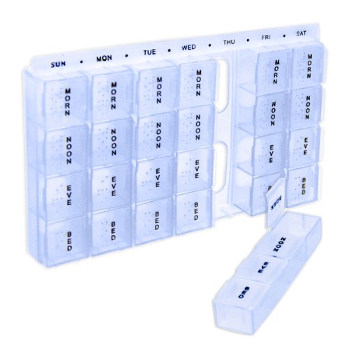 - Identified by weekday plus morning, noon, evening and bedtime with Braille; 6-3/4" x 4-1/4" x 3/4"