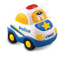 VTech 709251, Product Description Your child can listen and learn with the Vtech Go! Go! Smart Wheels Learning Car - Police. This electronic car is perfectly sized for little hands and entertains your child with a light-up driver button that activates music and sounds. Your little one will learn about the letter "P" and the name of the vehicle through pretend play. For added fun, this little patrol car interacts with VTech's Play & Repair Body Shop (sold separately).